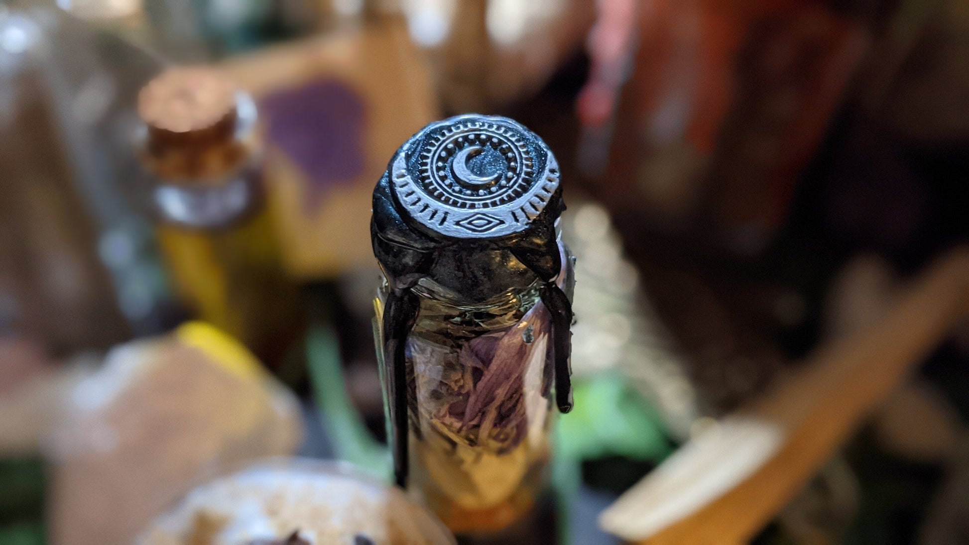 Please note that no two spell bottles look alike, since they are custom made with a variety of ingredients and each wax melt is unique.