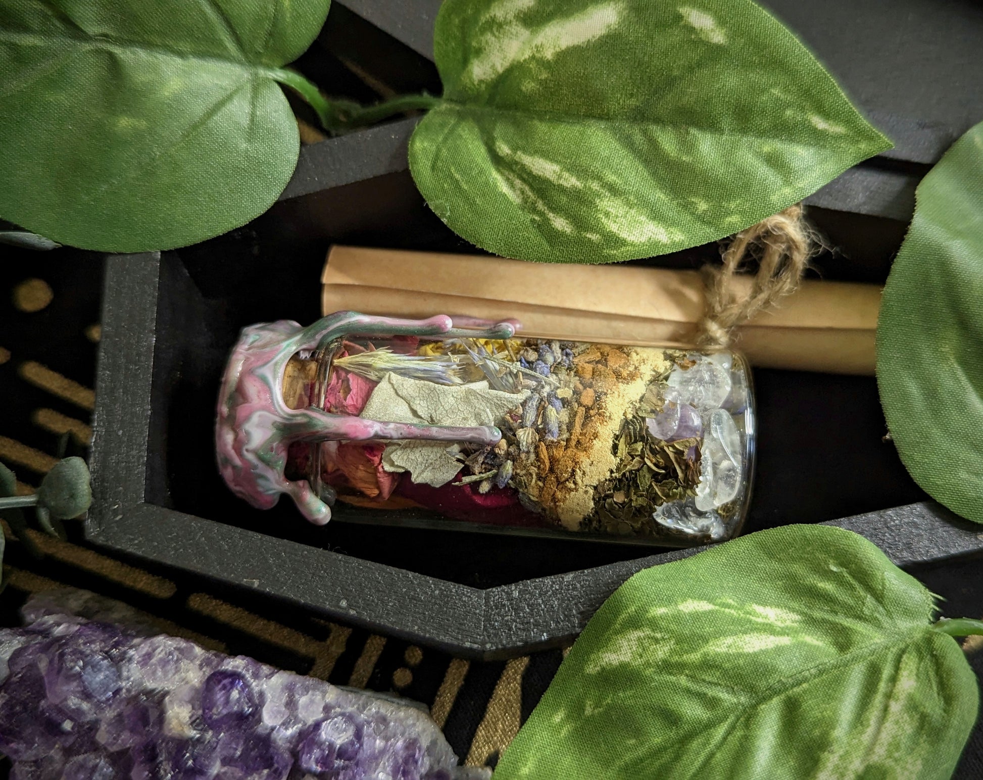 This custom spell jar will be handmade and enchanted to help the user with the intentions that they state. Each jar comes with a spell scroll detailing what is inside, why, and how to use it.