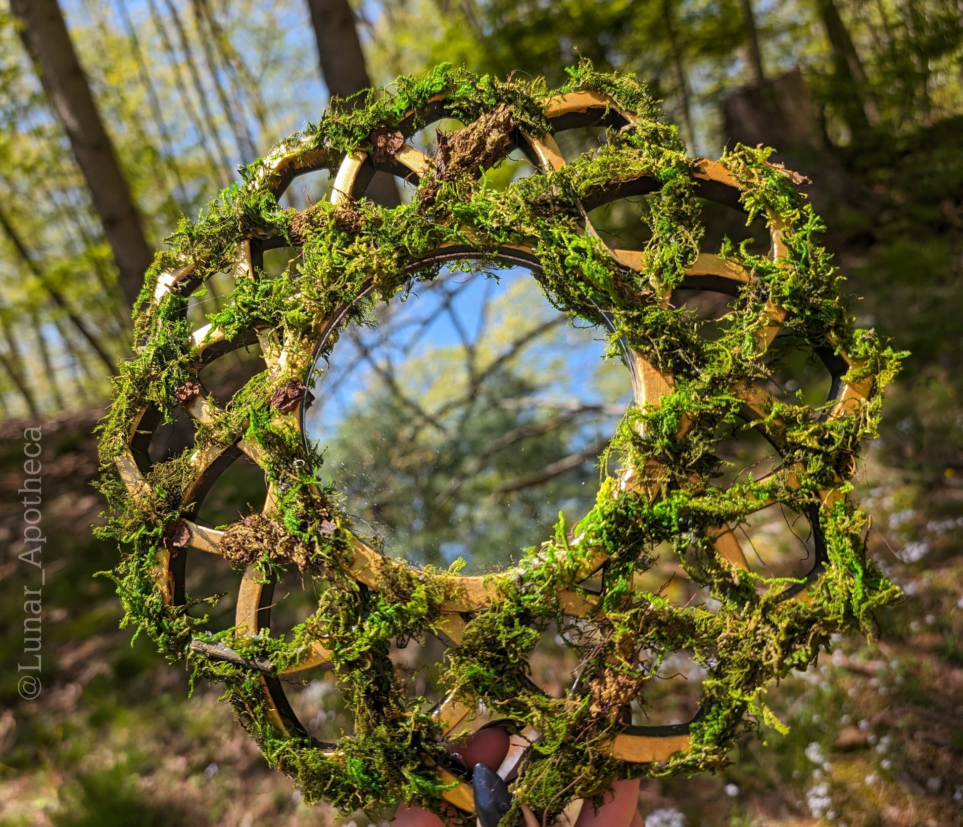 Real Preserved Tree Moss, Mood Moss, and Reindeer Moss on a hand painted and distressed mirror, which has a notch on the back for hanging.