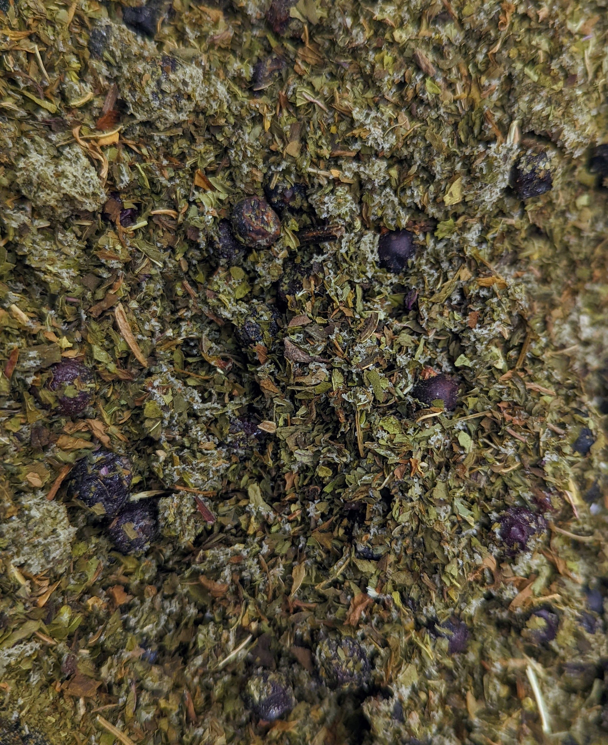 Ingredients: Peppermint Leaf, Spearmint Leaf, Juniper Berries, Dehydrated Bee Honey (Bee Honey, Maltodextrin, and Silicon Dioxide).