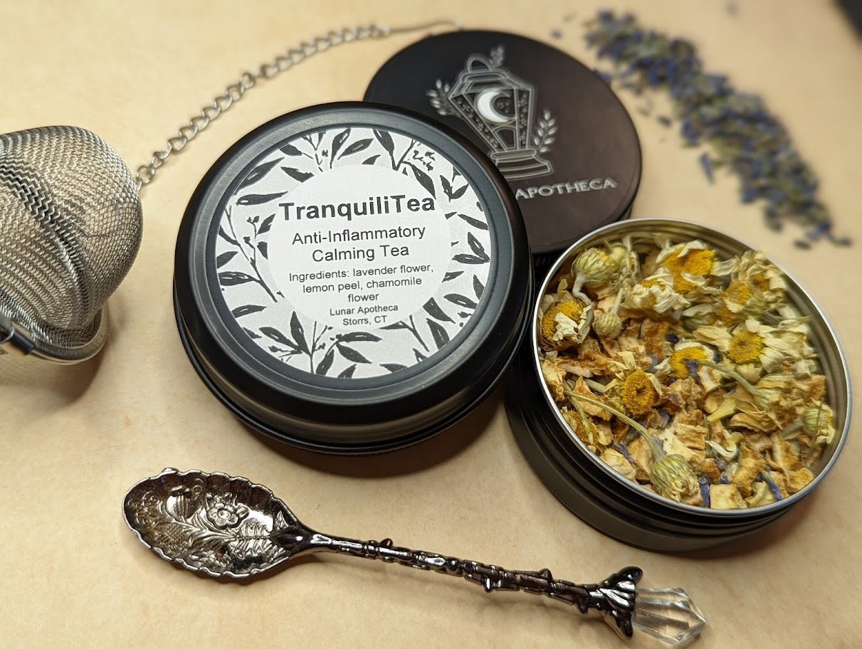 TranquiliTea is made from 100% organic ingredients, and features flowers which are known to reduce inflammation, encourage relaxation, and promote sleep. It has a citrus and floral taste, and is great for unwinding or enjoying before bed.