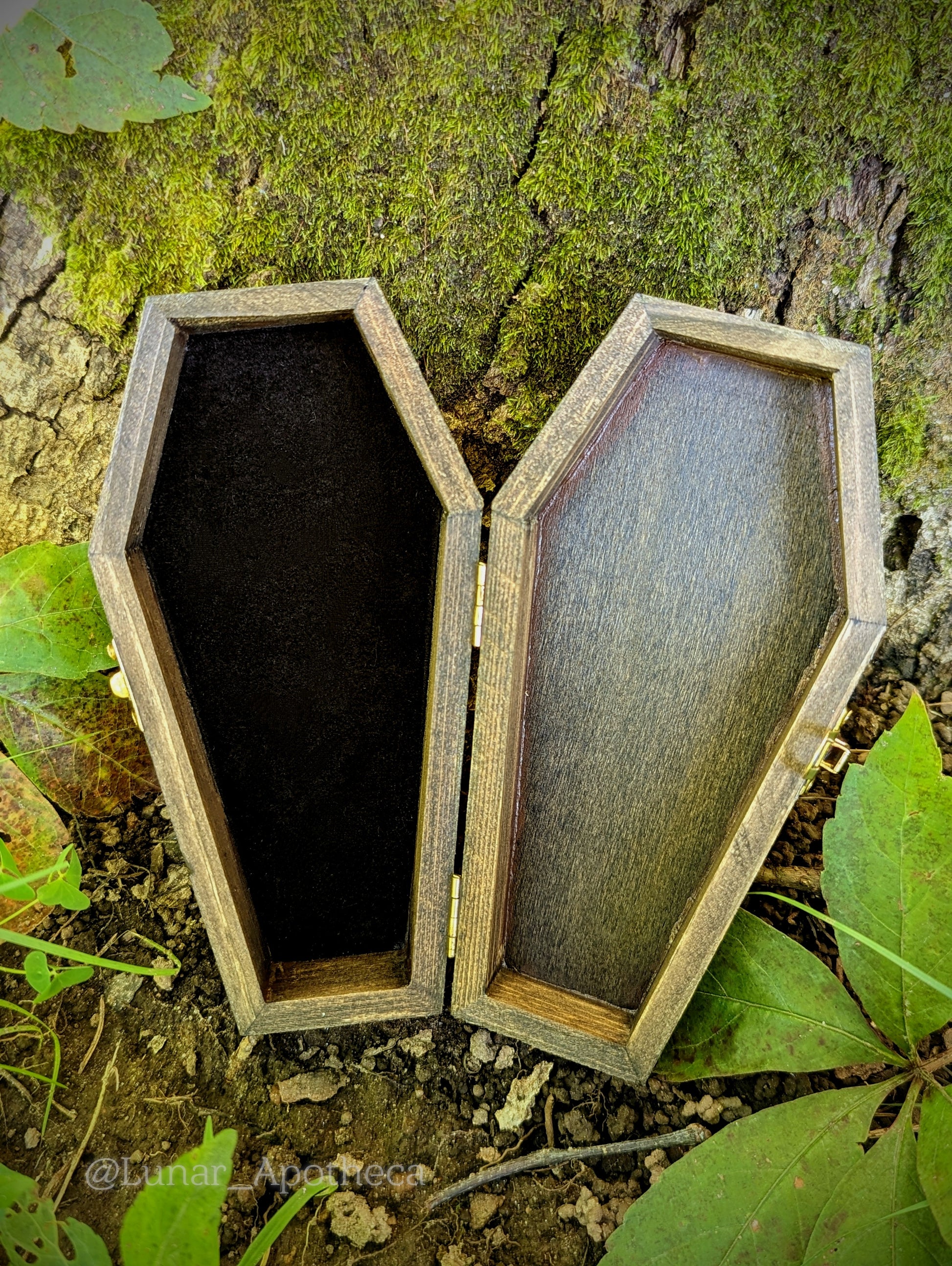 A hand-distressed and cured wooden coffin box lined on the inside bottom with velvet. The bottom is hand painted with a cosmic design.