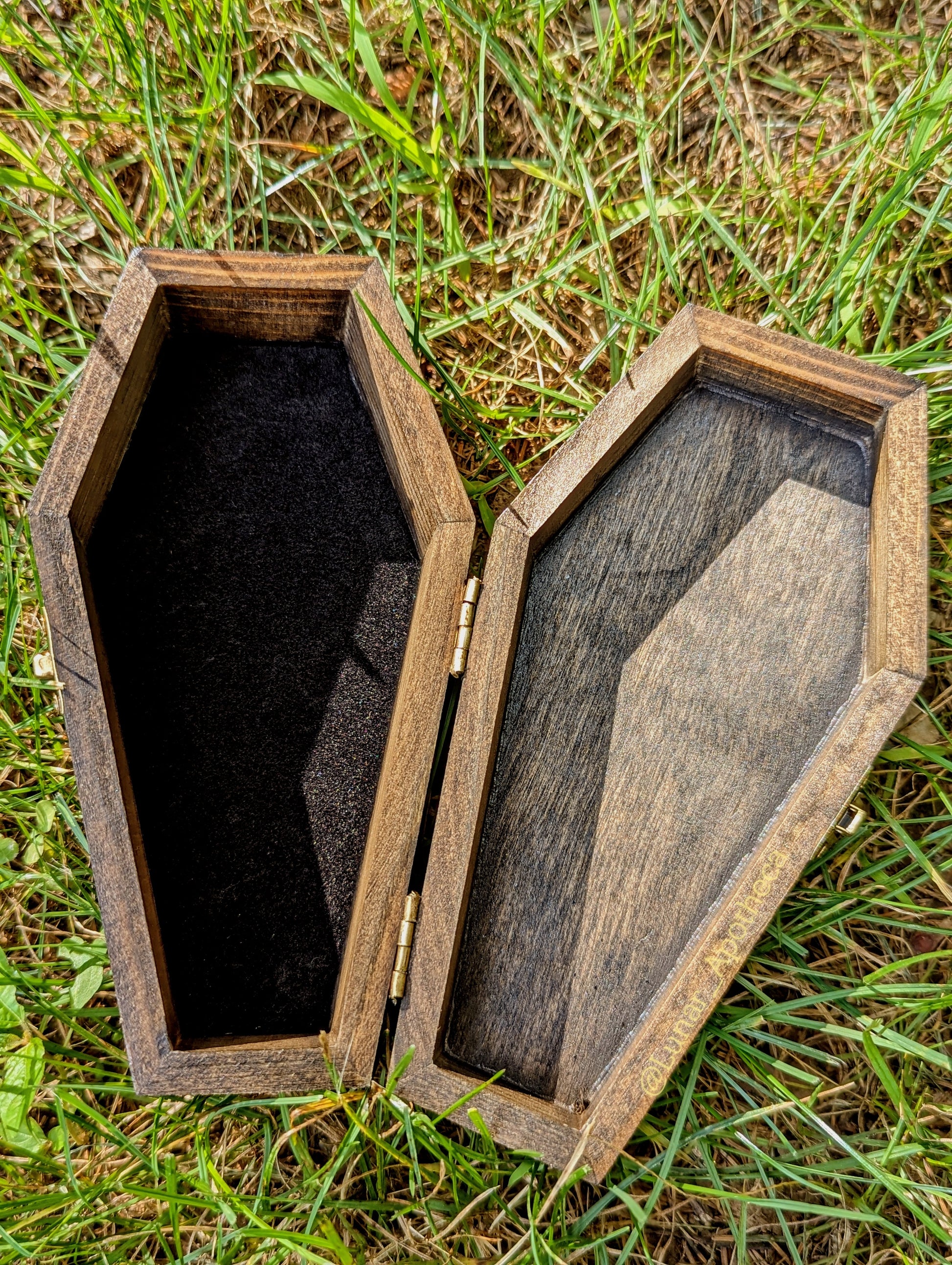 A hand-distressed and cured wooden coffin box lined on the inside bottom with velvet! This box is perfect for your altar, a portable altar, stashing personal items, or using for trinkets.