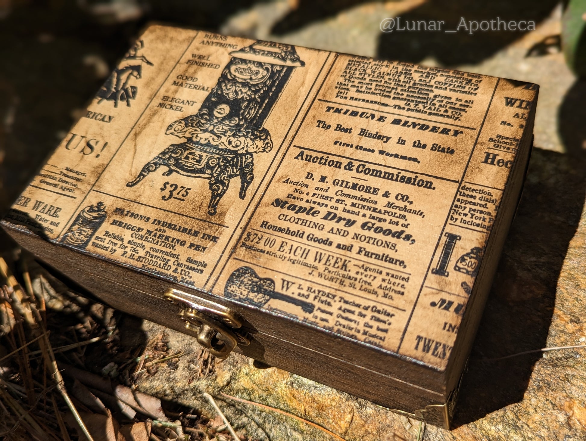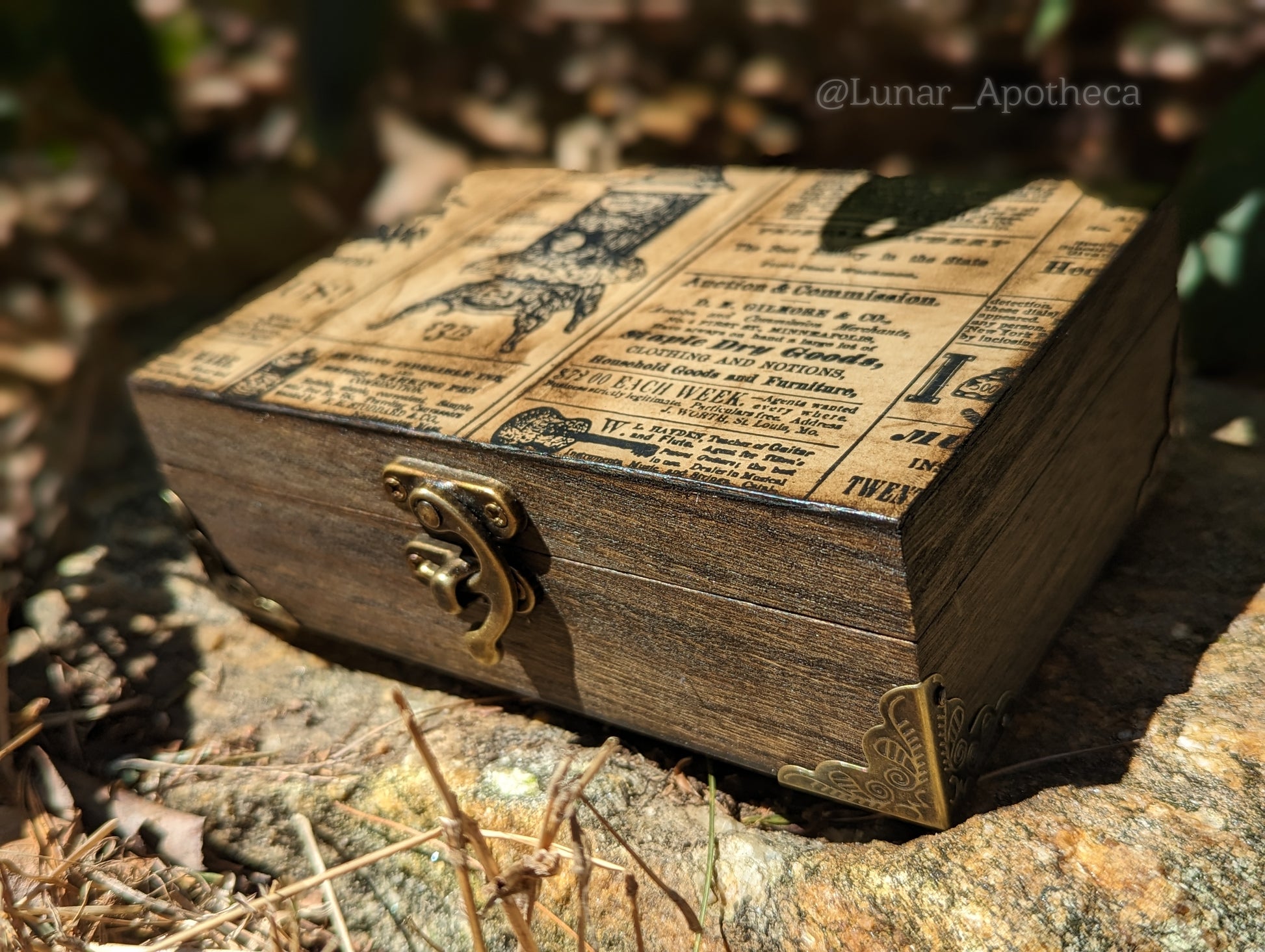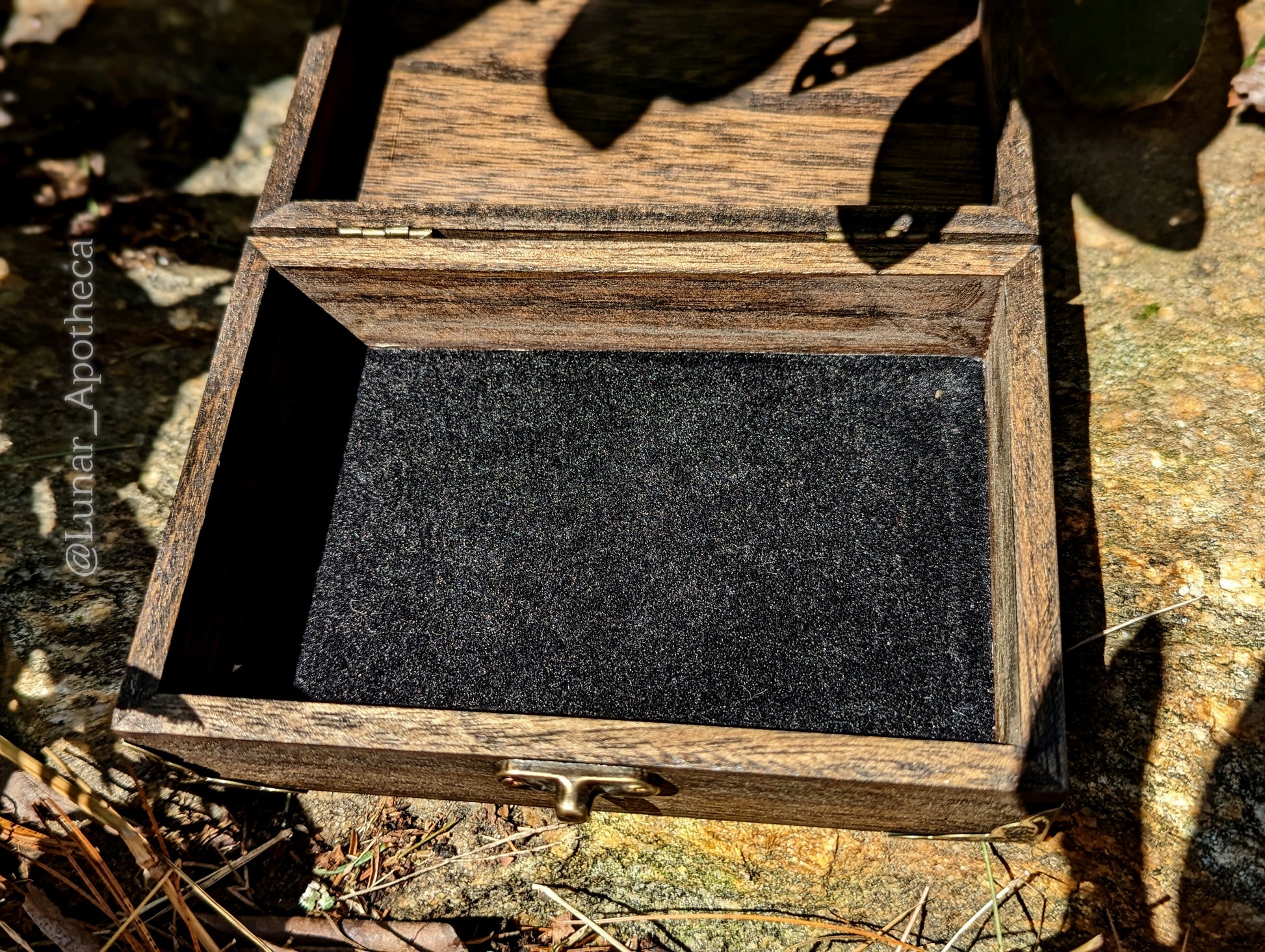 A hand-distressed and cured wooden box lined on the inside bottom with velvet! This box is perfect for your keepsakes, a portable altar, stashing personal items, or using for trinkets.